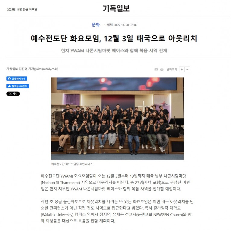 [기사] 예수전도단 화요모임, 12월 3일 태국으로 아웃리치(기독일보)