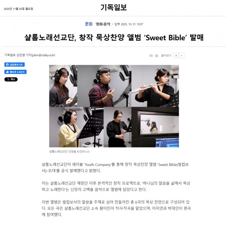 [기사] 샬롬노래선교단, 창작 묵상찬양 앨범 ‘Sweet Bible’ 발매(기독일보)