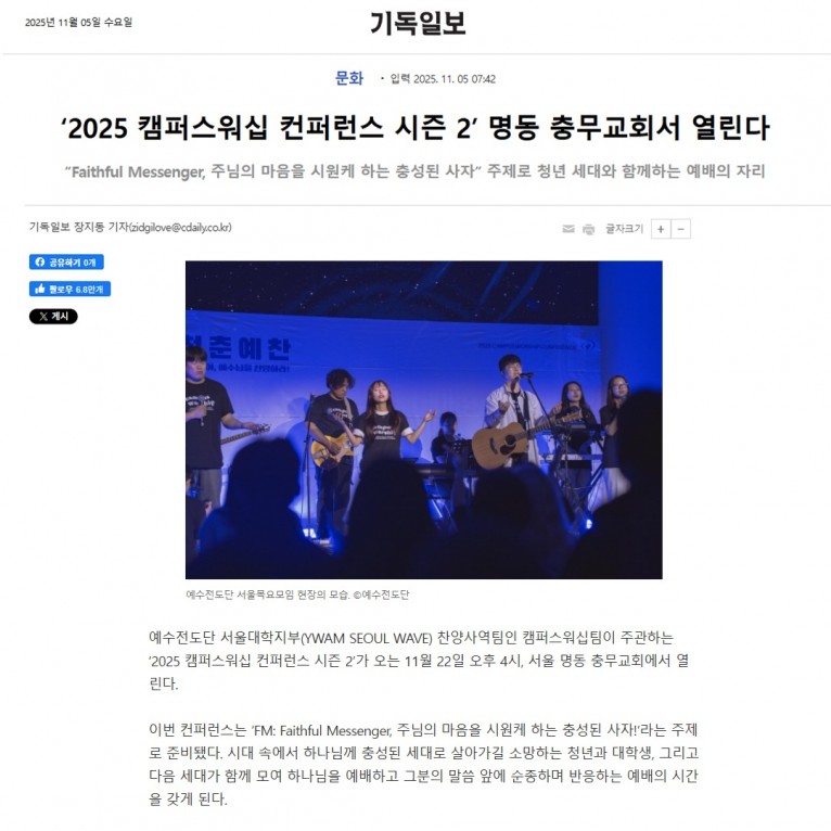 뮤직타임 [기사] ‘2025 캠퍼스워십 컨퍼런스 시즌 2’ 명동 충무교회서 열린다(기독일보)