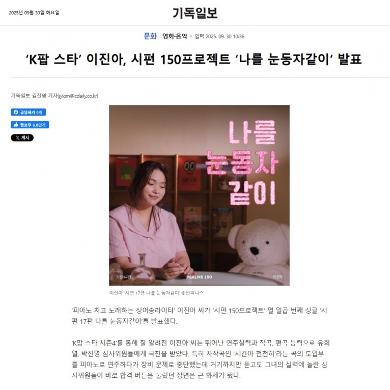 [기사] ‘K팝 스타’ 이진아, 시편 150프로젝트 ‘나를 눈동자같이‘ 발표(기독일보)