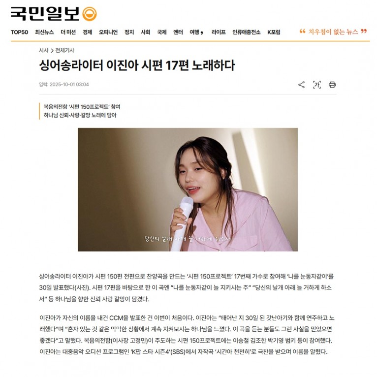[기사] 싱어송라이터 이진아 시편 17편 노래하다(국민일보)