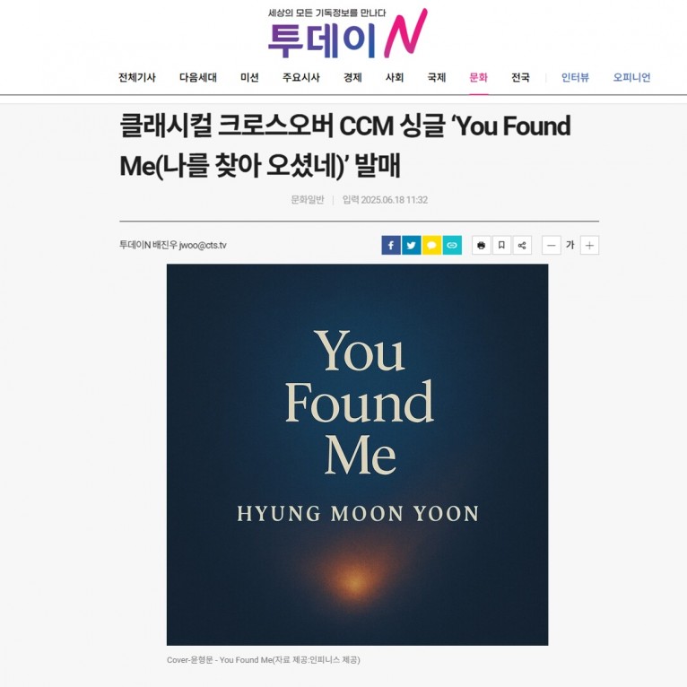 [기사] 클래시컬 크로스오버 CCM 싱글 ‘You Found Me(나를 찾아 오셨네)’ 발매(CTS 투데이N)