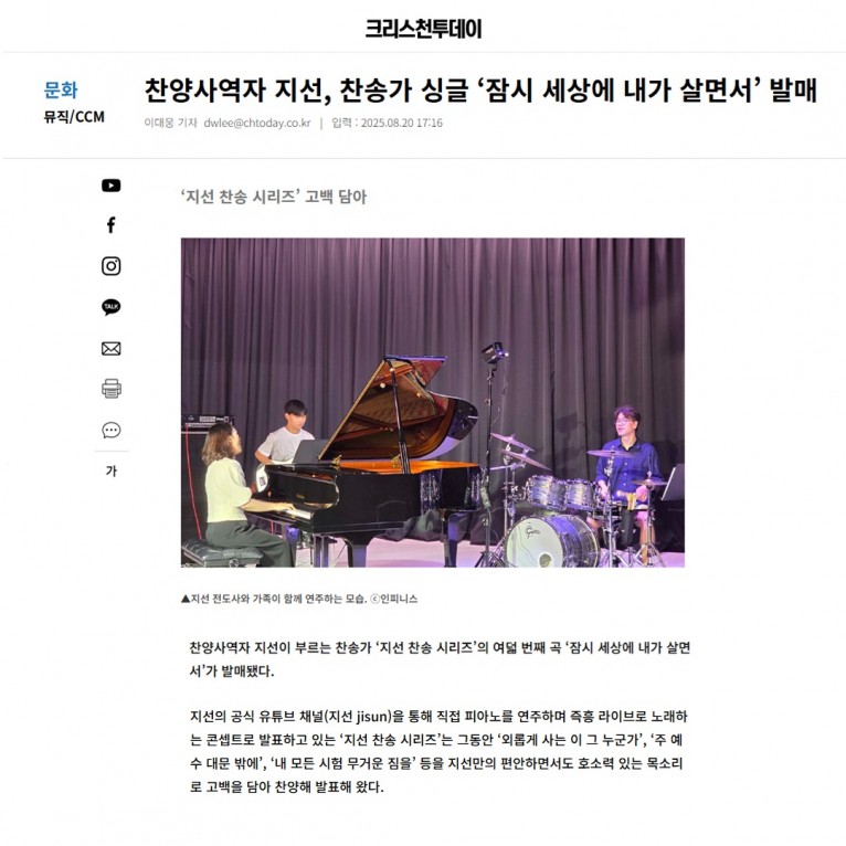 [기사] 찬양사역자 지선, 찬송가 싱글 ‘잠시 세상에 내가 살면서’ 발매(크리스천투데이)