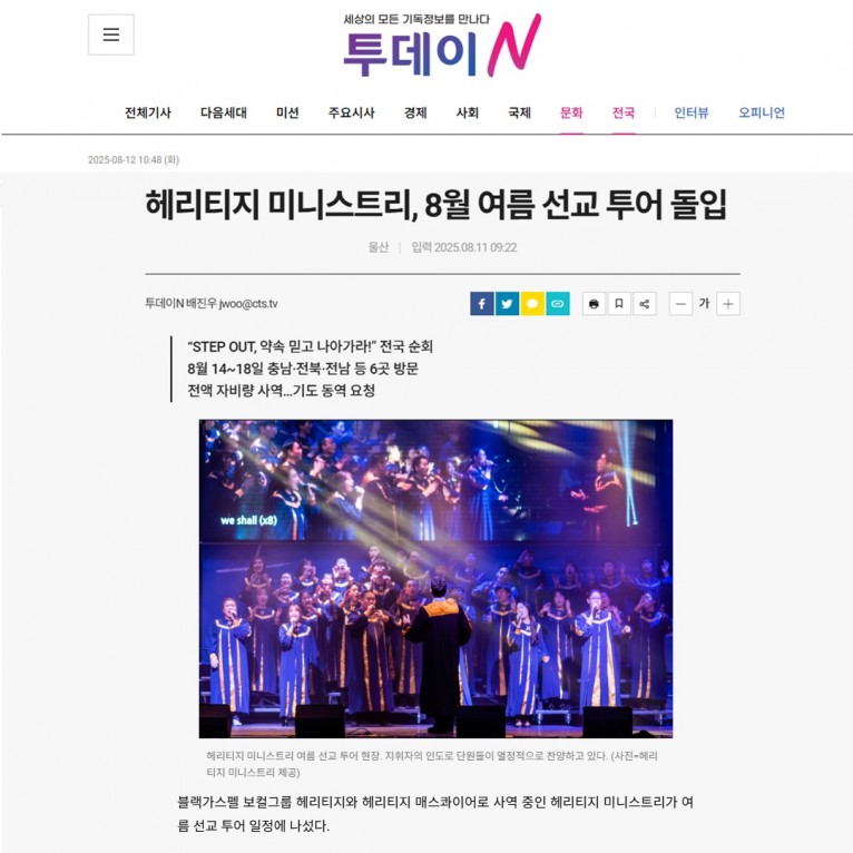 뮤직타임 [기사] 헤리티지 미니스트리, 8월 여름 선교 투어 돌입(CTS 투데이N)