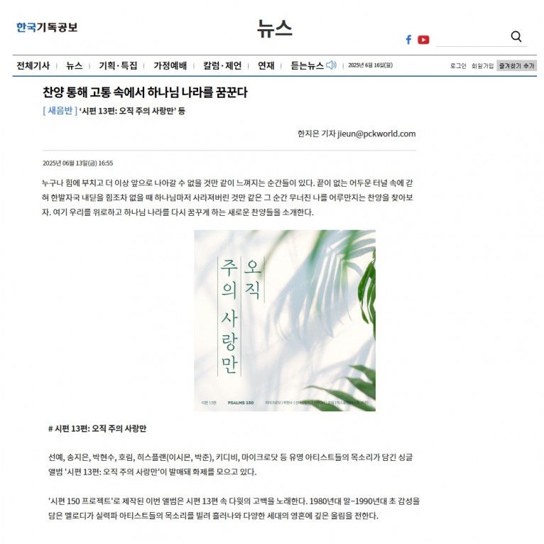 뮤직타임 [기사] 찬양 통해 고통 속에서 하나님 나라를 꿈꾼다 ‘시편 13편 오직 주의 사랑만’(한국기독공보)