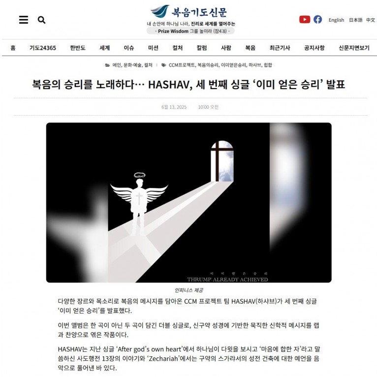 뮤직타임 [기사] 복음의 승리를 노래하다… HASHAV, 세 번째 싱글 ‘이미 얻은 승리’ 발표(복음기도신문)