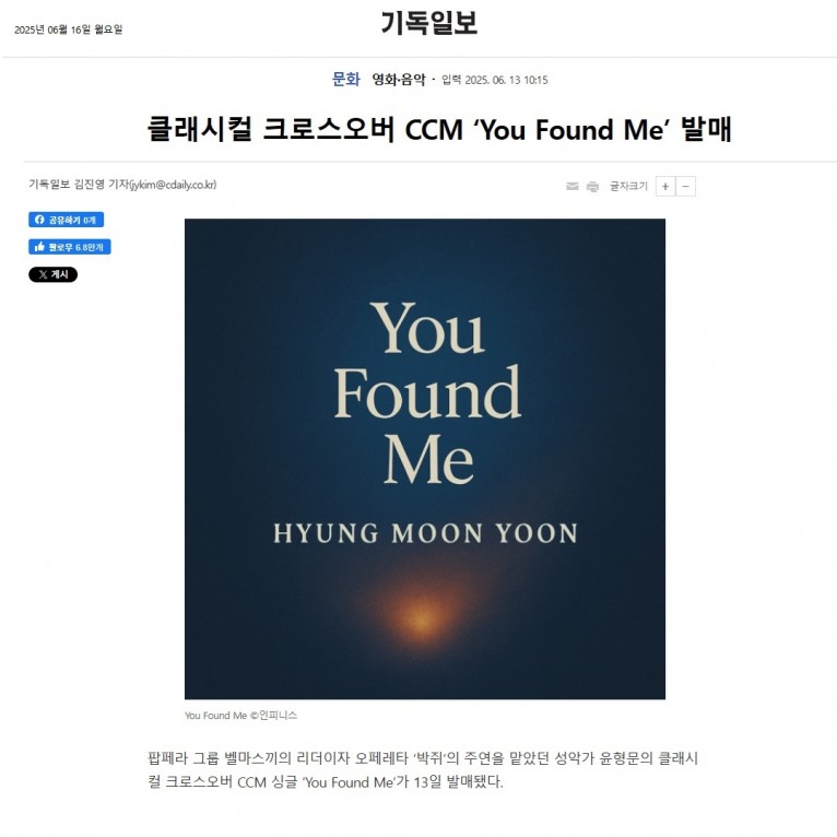 [기사] 클래시컬 크로스오버 CCM ‘You Found Me’ 발매(기독일보)