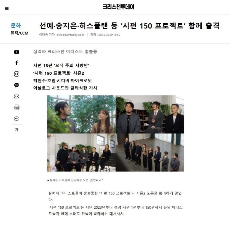 [기사] 선예·송지은·히스플랜 등 ‘시편 150 프로젝트’ 함께 출격(크리스천투데이)