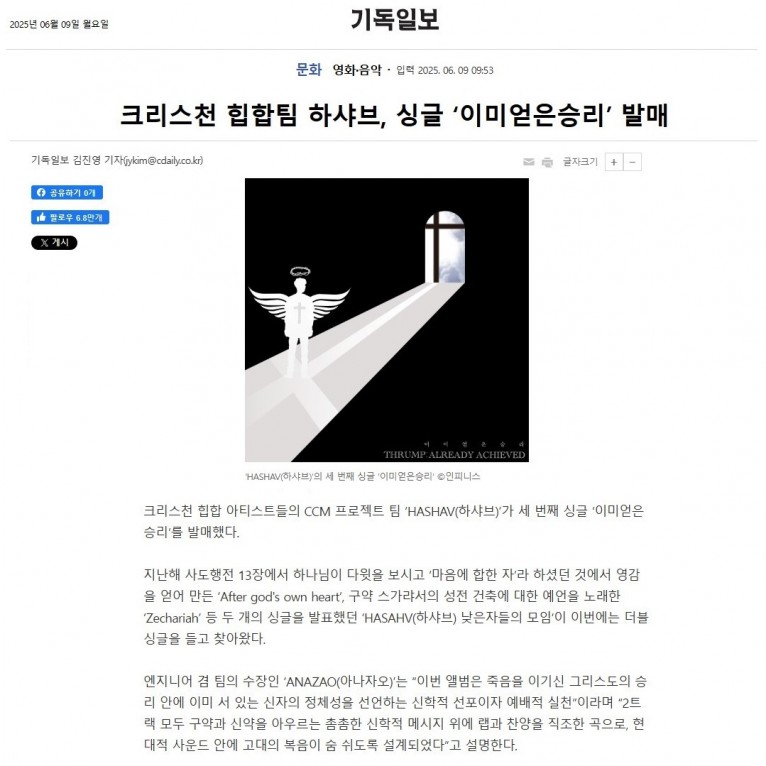 뮤직타임 [기사] 크리스천 힙합팀 하샤브, 싱글 '이미얻은승리' 발매(기독일보)