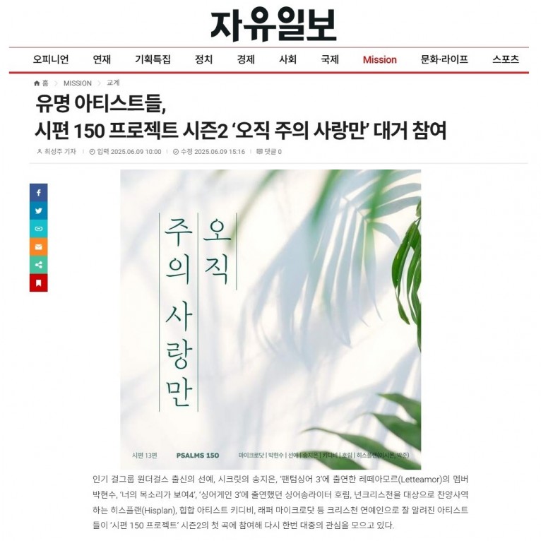 [기사] 유명 아티스트들, 시편 150 프로젝트 시즌2 ‘오직 주의 사랑만’ 대거 참여(자유일보)