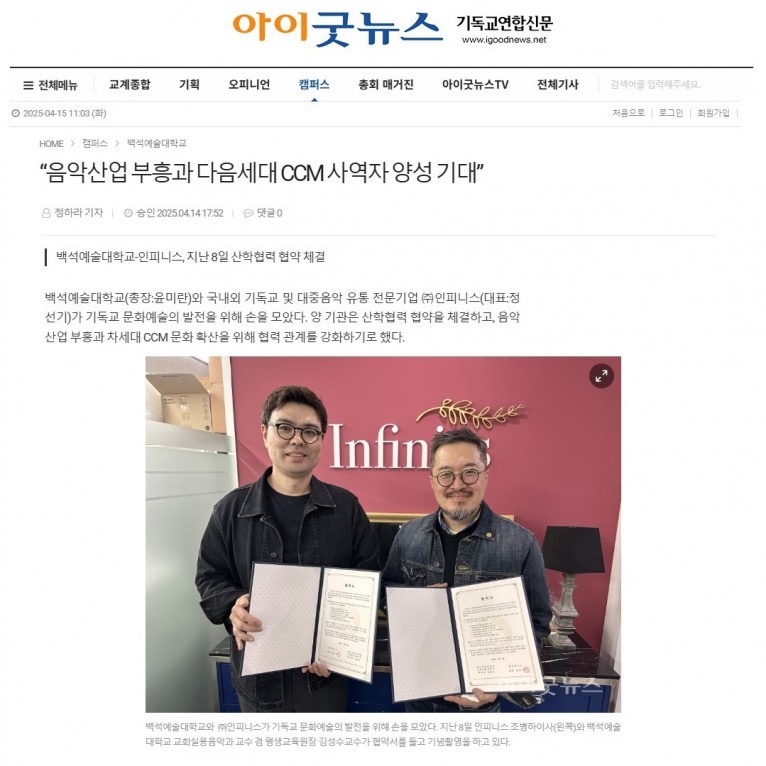 [기사] “음악산업 부흥과 다음세대 CCM 사역자 양성 기대”(아이굿뉴스 기독교연합신문)