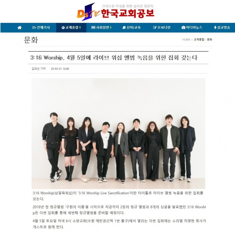 뮤직타임 [기사] 3:16 Worship, 4월 5일에 라이브 워십 앨범 녹음을 위한 집회 갖는다(한국교회공보)