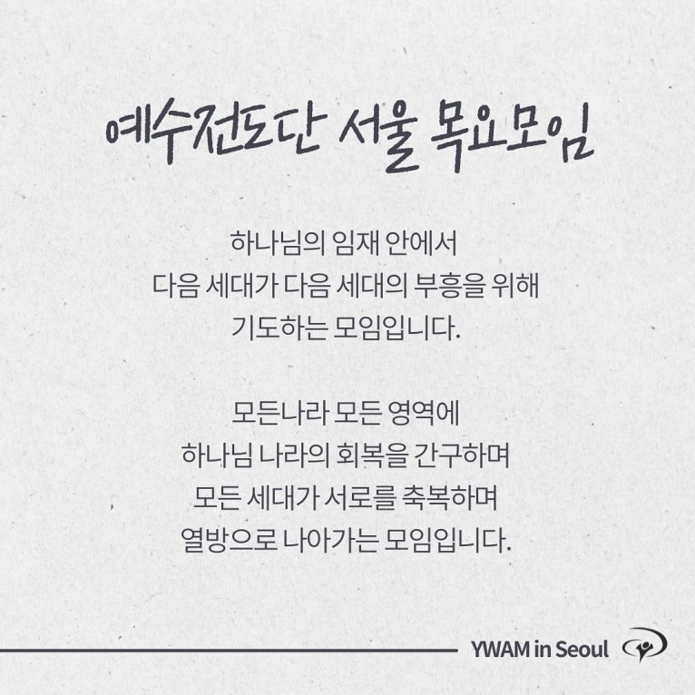 이처럼 서울 목요모임은 하나님의 임재와 그분을 향한 경배, 그리고 친밀함 안에서 드리는 중보로의 반응, 또 다음세대와 열방과 삶의 모든 곳을 축복하며 서로를 파송하여 모든 곳에 축복이 되는 모임이 되길 원합니다.