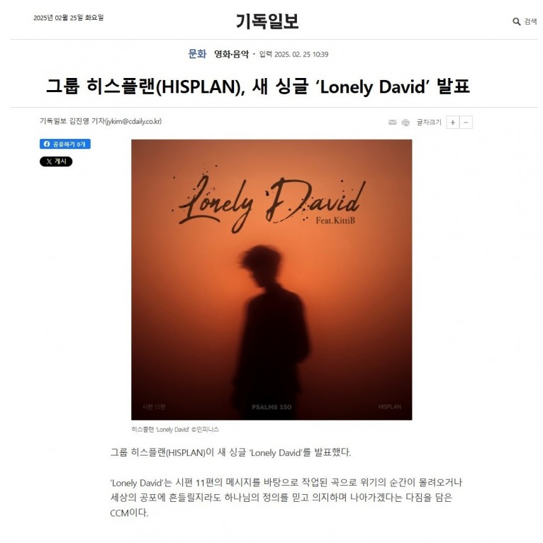[기사] 그룹 히스플랜(HISPLAN), 새 싱글 ‘Lonely David’ 발표(기독일보)