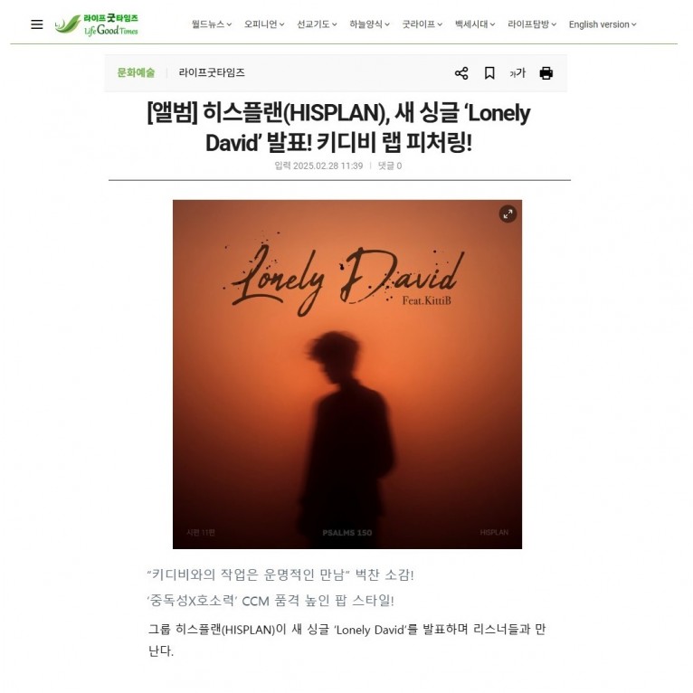 [기사] 히스플랜(HISPLAN), 새 싱글 ‘Lonely David’ 발표! 키디비 랩 피처링!(라이프굿타임즈)