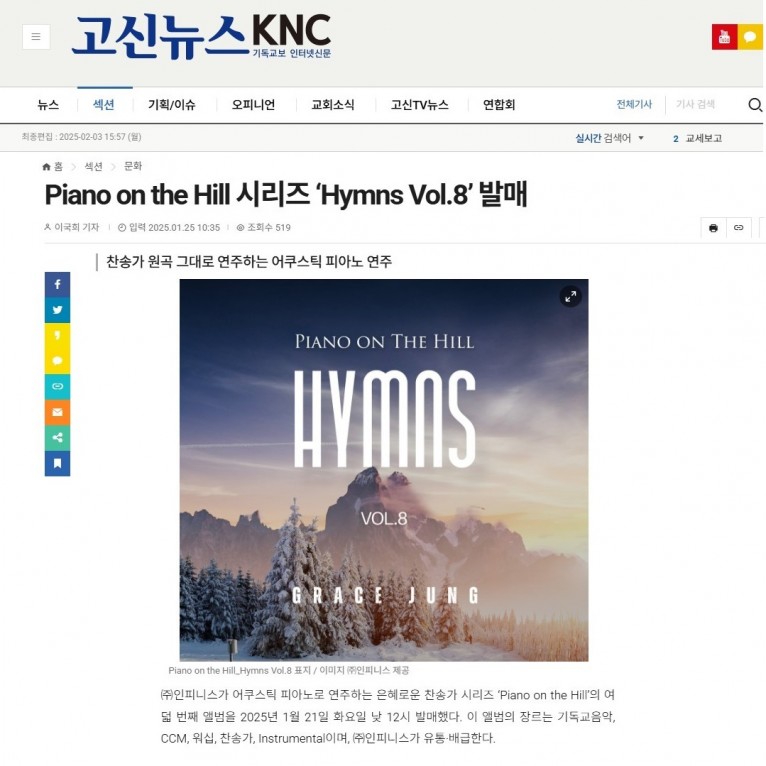 [기사] Piano on the Hill 시리즈 ‘Hymns Vol.8’ 발매(고신뉴스 KNC)
