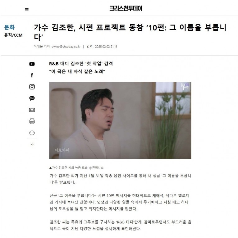 [기사] 가수 김조한, 시편 프로젝트 동참 ‘10편 그 이름을 부릅니다’(크리스천투데이)