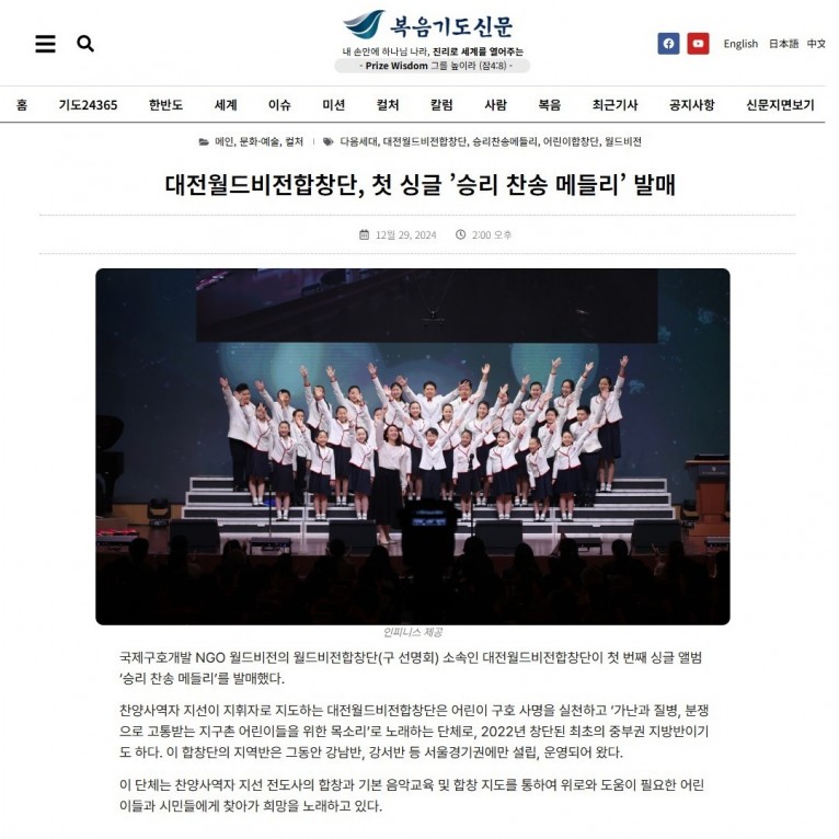 [기사] 대전월드비전합창단, 첫 싱글 ’승리 찬송 메들리’ 발매(복음기도신문)
