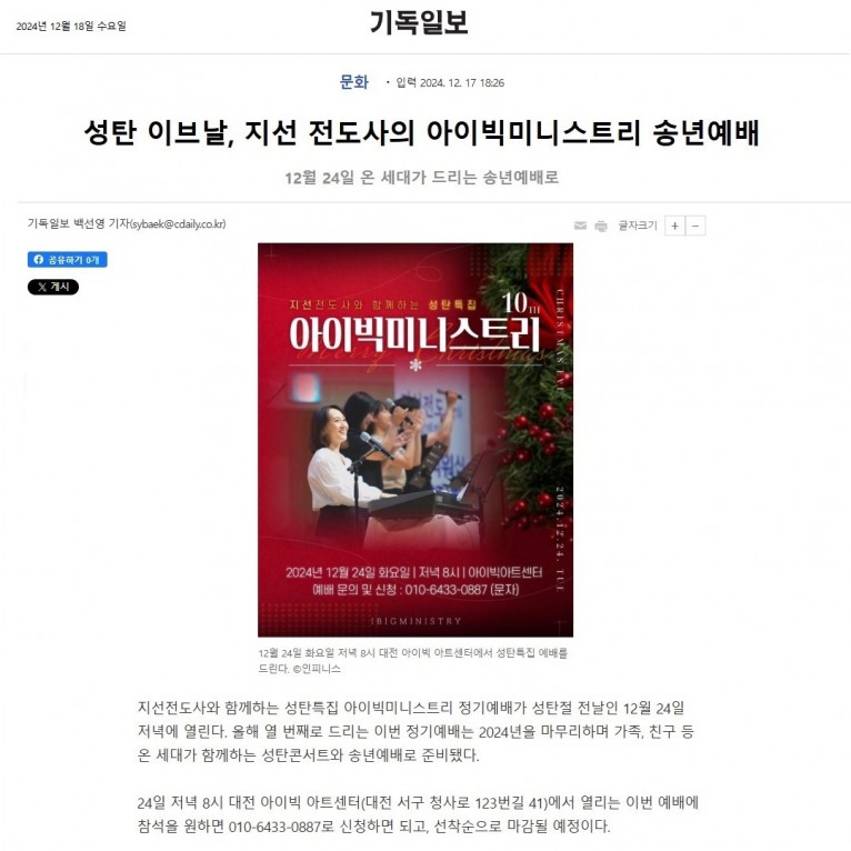 뮤직타임 [기사] 성탄 이브날, 지선 전도사의 아이빅미니스트리 송년예배(기독일보)