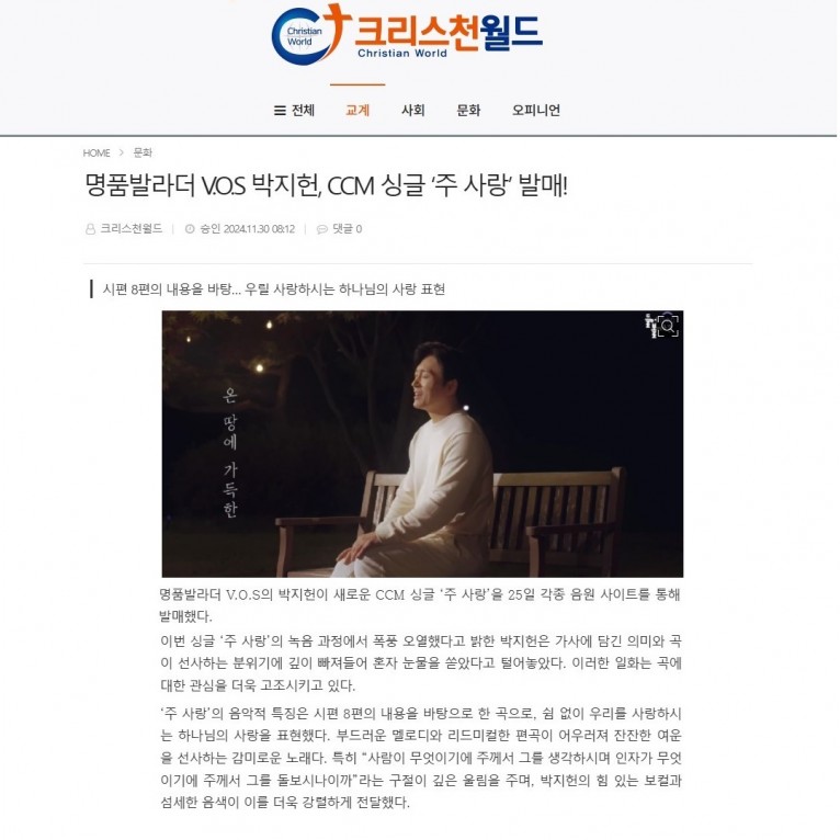[기사] 명품발라더 V.O.S 박지헌, CCM 싱글 ‘주 사랑’ 발매!(크리스천월드)