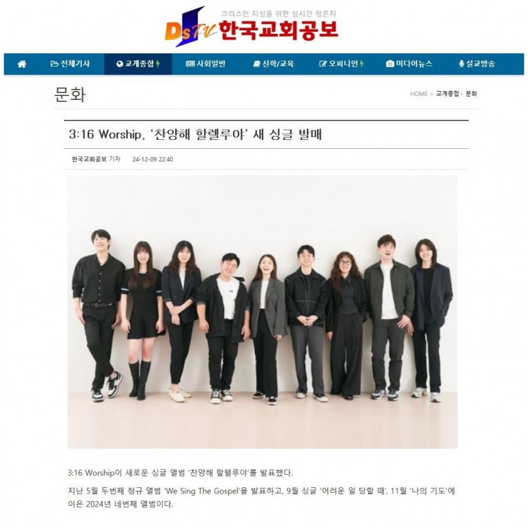 뮤직타임 [기사] 3:16 Worship, ‘찬양해 할렐루야’ 새 싱글 발매(한국교회공보)