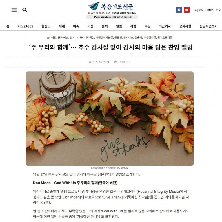 뮤직타임 [기획기사] ‘주 우리와 함께’… 추수 감사절 맞아 감사의 마음 담은 찬양 앨범(복음기도신문)