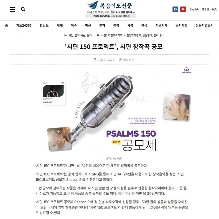 ‘시편 150 프로젝트’는 공식 웹사이트와 SNS를 통해 시편 14~24편을 내용으로 한 창작음악을 찾는 ‘시편 150 프로젝트 공모제 Season 2’를 진행한다고 밝혔다.