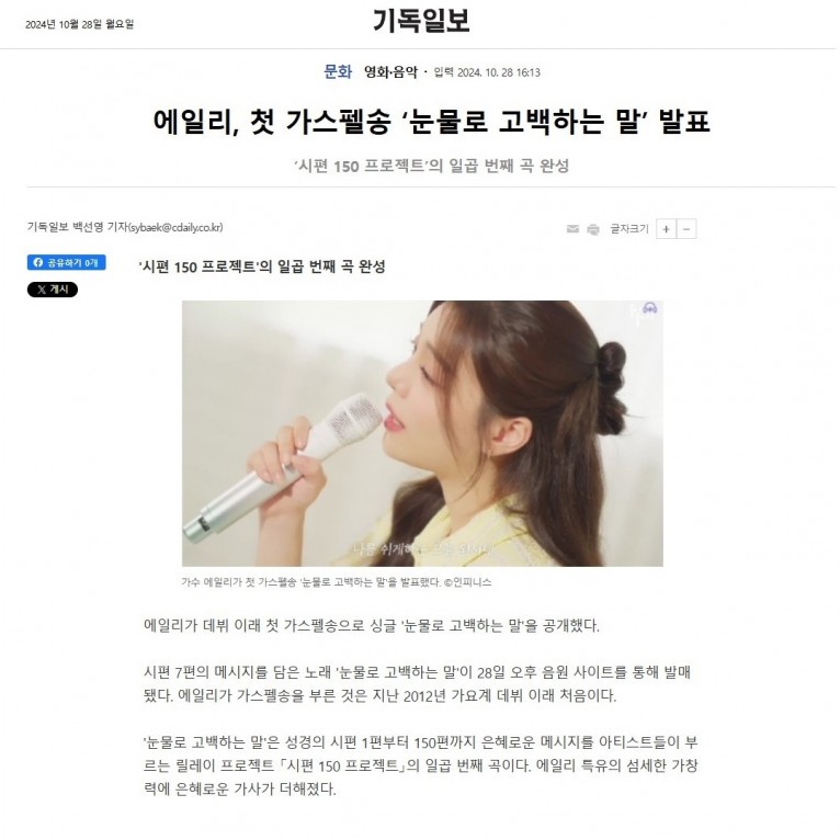 [기사] 에일리, 첫 가스펠송 ‘눈물로 고백하는 말’ 발표(기독일보)