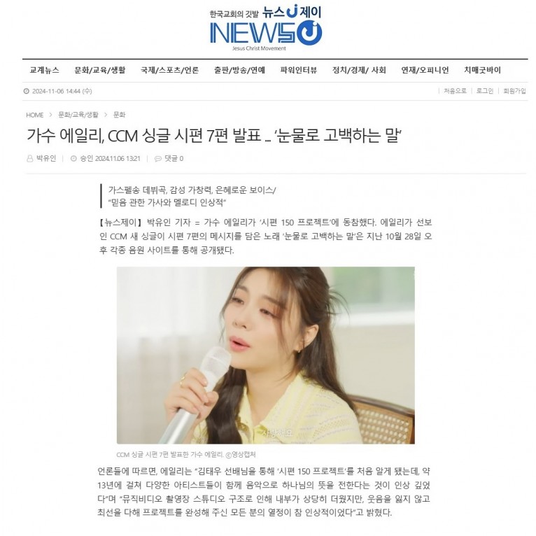 뮤직타임 [기사] 가수 에일리, CCM 싱글 시편 7편 발표 ... ‘눈물로 고백하는 말’(뉴스제이)