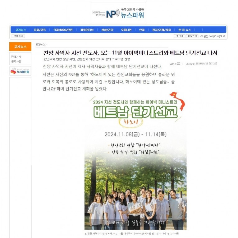 [기사] 찬양 사역자 지선 전도사, 오는 11월 아이빅미니스트리와 베트남 단기선교 나서(뉴스파워)