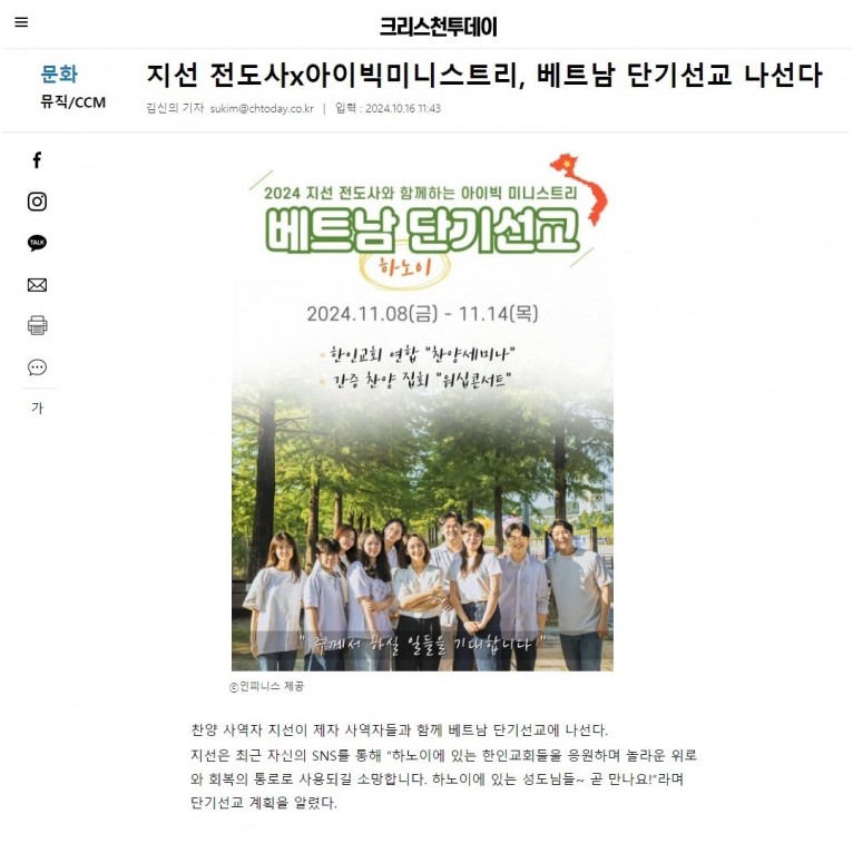 [기사] 지선 전도사x아이빅미니스트리, 베트남 단기선교 나선다(크리스천투데이)