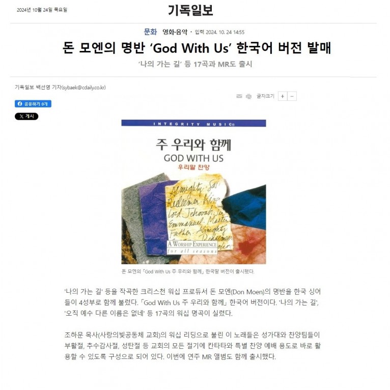 뮤직타임 [기사] 돈 모엔의 명반 ‘God With Us’ 한국어 버전 발매(기독일보)