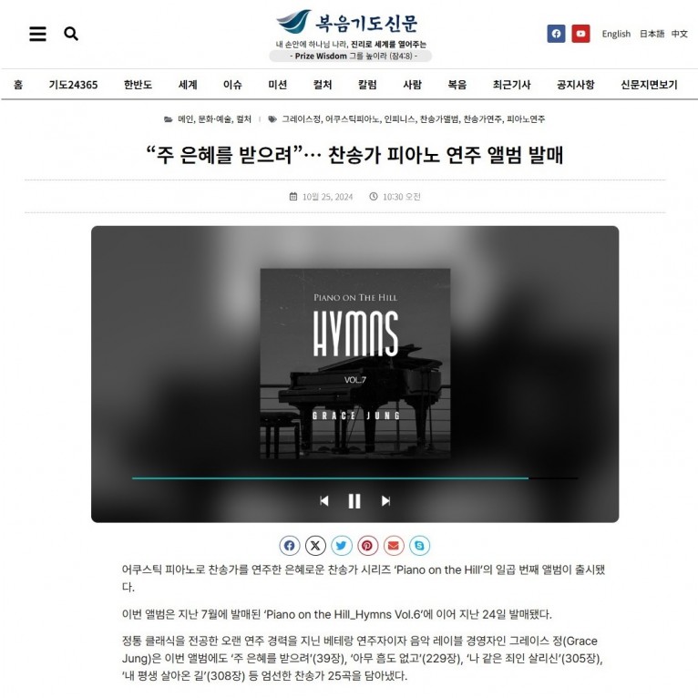 [기사] “주 은혜를 받으려”… 찬송가 피아노 연주 앨범 발매(복음기도신문)