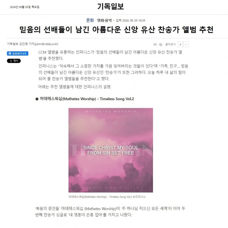 인피니스는 ”익숙해서 그 소중한 가치를 가끔 잊어버리는 것들이 있다”며 “가족, 친구… 믿음의 선배들이 남긴 아름다운 신앙 유산인 ‘찬송가’가 또한 그러하다. 오늘 하루 내 삶의 힘이 되어 줄 찬송가 앨범들을 추천한다”고 했다.