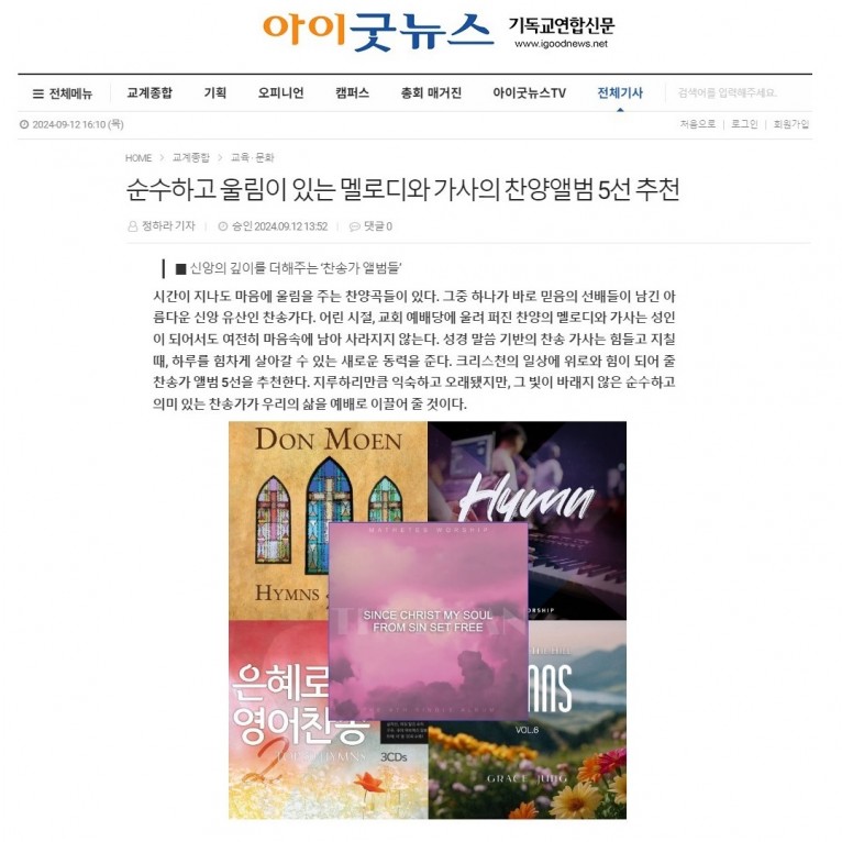 [기획기사] 순수하고 울림이 있는 멜로디와 가사의 찬양앨범 5선 추천(아이굿뉴스 기독교연합신문)
