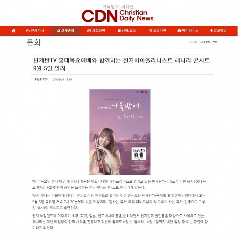 [기사] 번개탄TV 홍대목요예배와 함께하는 전자바이올리니스트 해나리 콘서트 9월 5일 열려(기독일보 씨디엔)