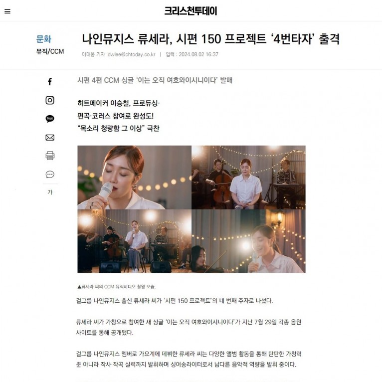 [기사] 나인뮤지스 류세라, 시편 150 프로젝트 ‘4번타자’ 출격(크리스천투데이)