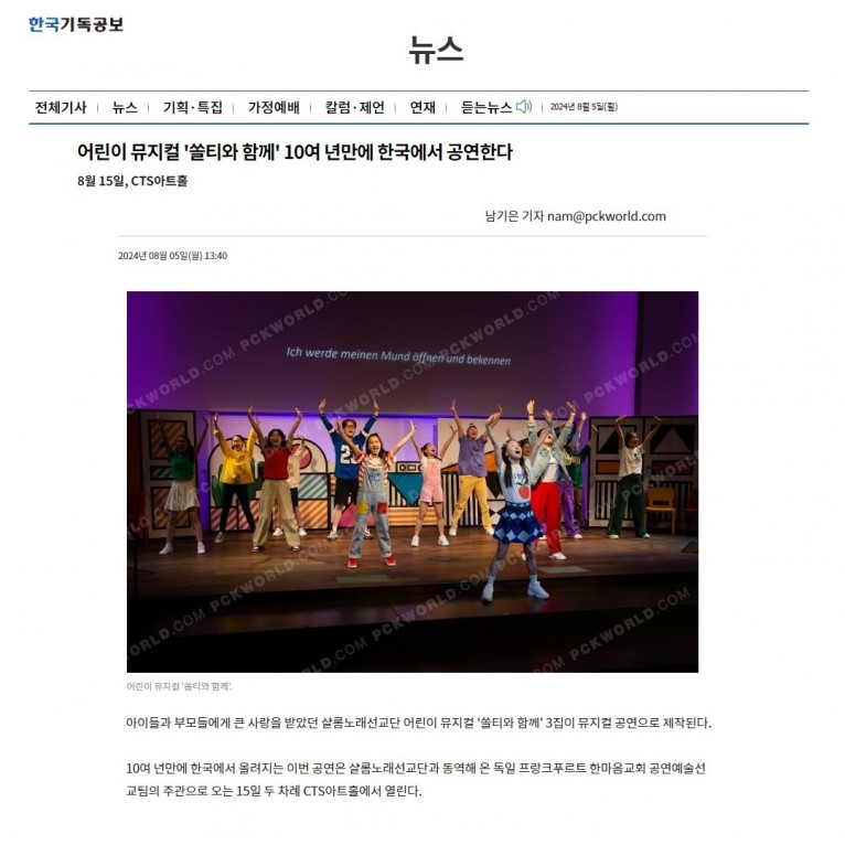 [기사] 어린이 뮤지컬 '쏠티와 함께' 10여 년만에 한국에서 공연한다(한국기독공보)