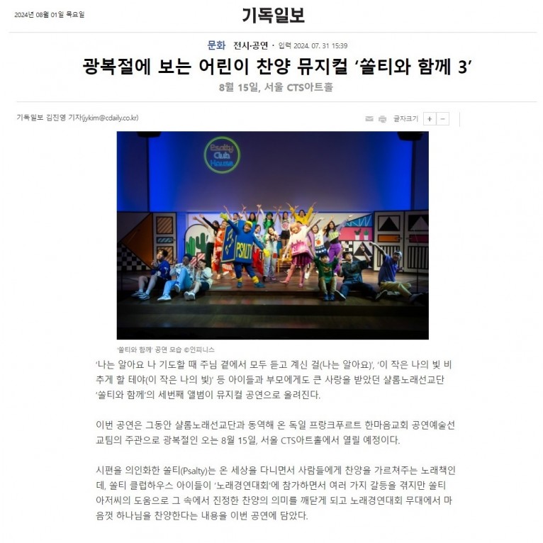 [기사] 광복절에 보는 어린이 찬양 뮤지컬 ‘쏠티와 함께 3’(기독일보)