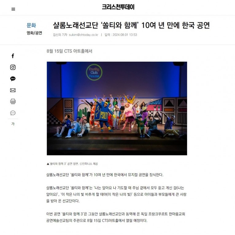 [기사] 샬롬노래선교단 ‘쏠티와 함께’ 10여 년 만에 한국 공연(크리스천투데이)