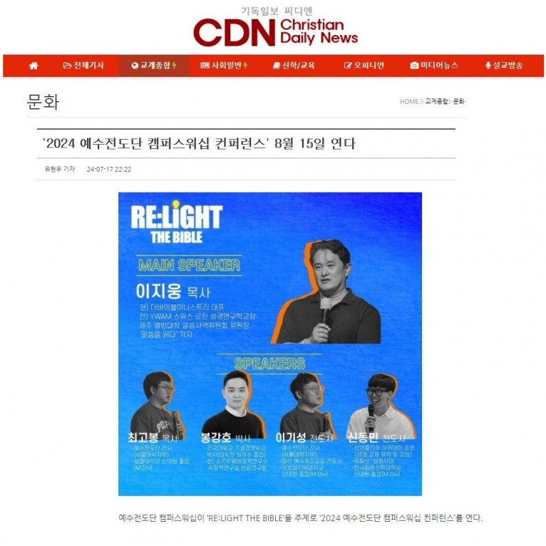 뮤직타임 [기사] '2024 예수전도단 캠퍼스워십 컨퍼런스' 8월 15일 연다(기독일보 씨디엔)