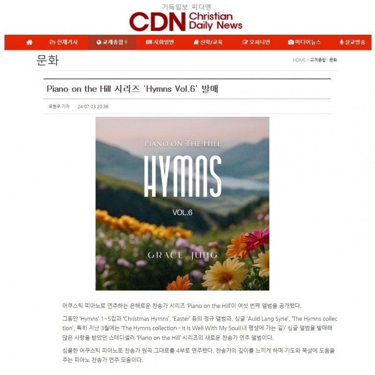 뮤직타임 [기사] Piano on the Hill 시리즈 'Hymns Vol.6' 발매(기독일보 씨디엔)