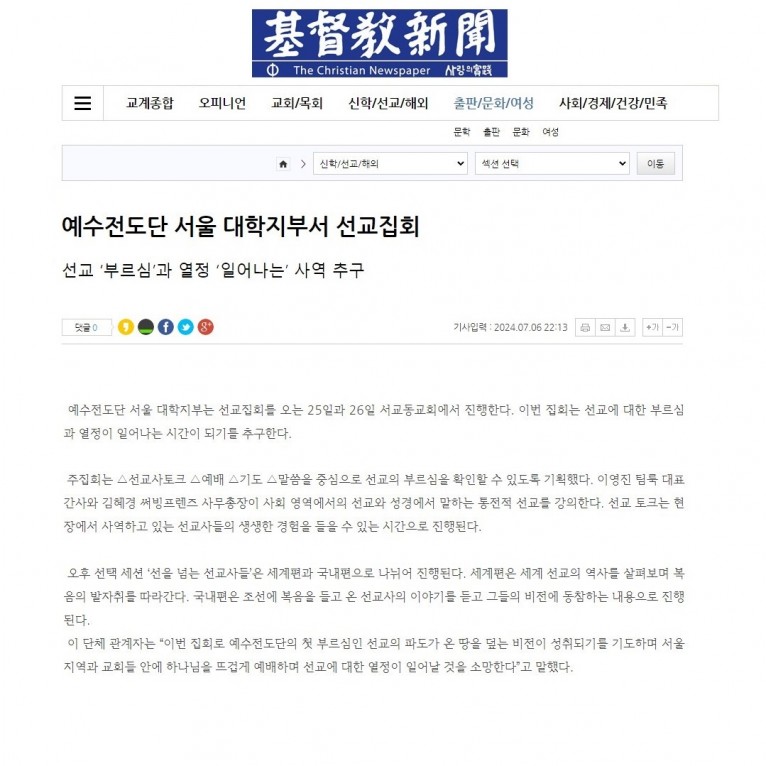 [기사] 예수전도단 서울 대학지부서 선교집회(기독교신문)