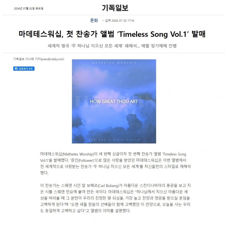 [기사] 마데테스워십, 첫 찬송가 앨범 ‘Timeless Song Vol.1’ 발매(기독일보)