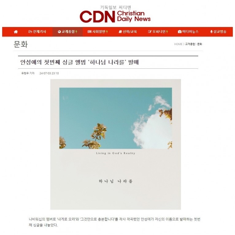 뮤직타임 [기사] 안성애의 첫번째 싱글 앨범 ‘하나님 나라를’ 발매(기독일보 씨디엔)