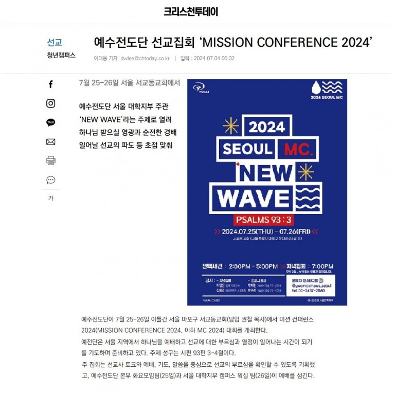 뮤직타임 [기사] 예수전도단 선교집회 ‘MISSION CONFERENCE 2024’(크리스천투데이)