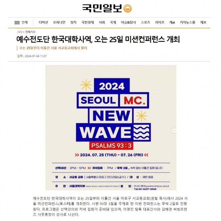 [기사] 예수전도단 한국대학사역, 오는 25일 미션컨퍼런스 개최(국민일보)