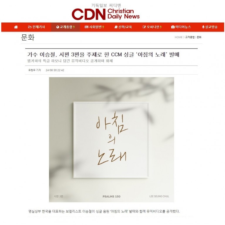 뮤직타임 [기사] 가수 이승철, 시편 3편을 주제로 한 CCM 싱글 ‘아침의 노래’ 발매(기독일보 씨디엔)