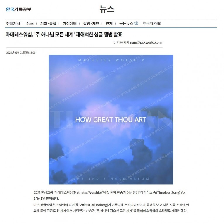 [기사] 마데테스워십, '주 하나님 모든 세계' 재해석한 싱글 앨범 발표(한국기독공보)