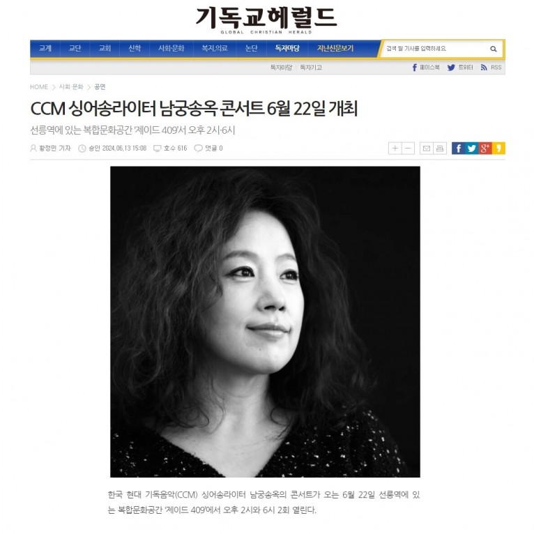[기사] CCM 싱어송라이터 남궁송옥 콘서트 6월 22일 개최(기독교헤럴드)